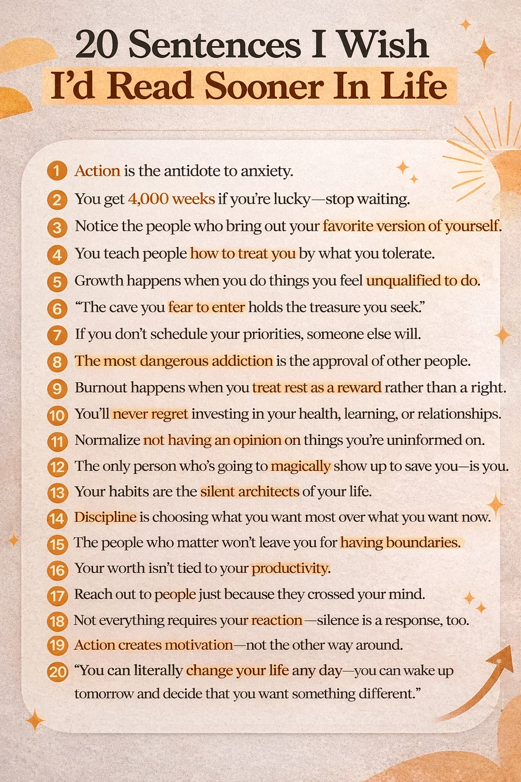 We often spend our lives waiting for a sign, a perfect moment, or a sudden burst of clarity that tells us exactly what to do next. However, the most profound truths are usually the ones we have heard a thousand times but never truly internalized. The image of those twenty sentences serves as a powerful mirror for the soul, reflecting back the simple yet transformative principles that dictate our happiness, our success, and our peace of mind. To live a life of purpose, we must move beyond merely reading these words and begin the courageous work of practicing them every single day.