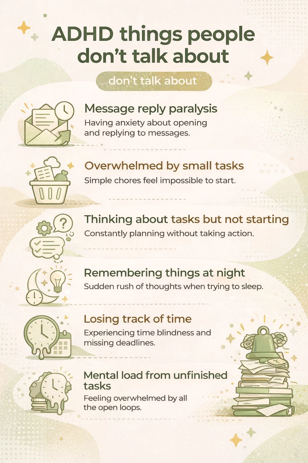 Understanding the things people don’t talk about regarding ADHD is more than just a lesson in symptoms; it is an invitation to view yourself with more kindness. The mental load map is a tool for navigation, helping you identify where the road gets rocky so you can prepare accordingly. By addressing message paralysis, time blindness, and the weight of unfinished tasks with practical strategies and self-compassion, you can navigate the world with greater ease.