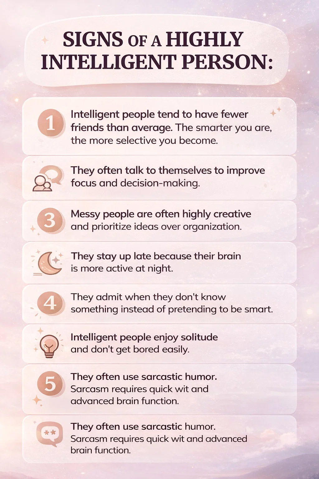 Intelligence is a multifaceted trait that goes far beyond what we learn in a classroom. It is reflected in our habits, our social preferences, and even our sense of humor. If you recognized yourself in these seven signs, it is time to embrace your unique cognitive blueprint. Whether you are staying up late, talking to yourself in a messy room, or choosing a quiet evening over a crowded party, remember that these are not flaws. They are the characteristics of a highly intelligent mind.