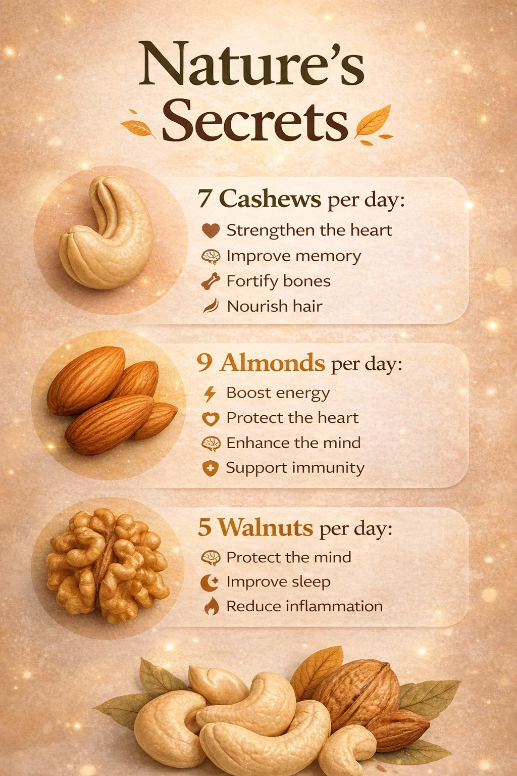Health does not always have to come from a bottle or a laboratory. Sometimes, the most effective remedies are those that have been around for millennia. By embracing the secrets of nature and committing to this simple daily ritual of seven cashews, nine almonds, and five walnuts, you are taking a proactive step toward a more vibrant life. You are nourishing your heart, protecting your mind, strengthening your bones, and even caring for your hair and skin with every bite. Start today and let these small wonders of nature guide you toward a state of holistic well being that lasts a lifetime. Save these tips and share them with someone who is ready to transform their health one handful at a time.