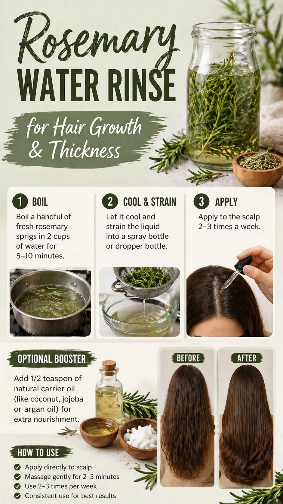 The image-inspired routine is simple: boil a handful of fresh rosemary sprigs in about two cups of water for 5 to 10 minutes, allow it to cool, then pour it into a clean spray or dropper bottle. From there, it can be applied to the scalp a few times per week and massaged in gently for a few minutes.